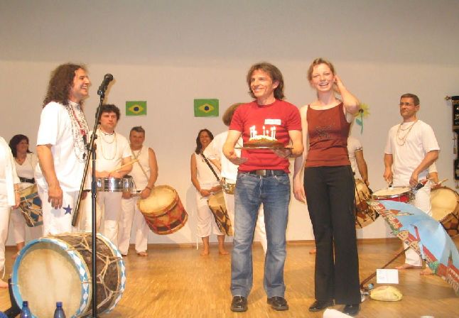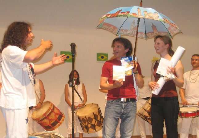 Wir übergeben Silke und Dirk typische Geschenke aus Augsburg von Sambamania für den Maracatu Nation Stern der Elbe